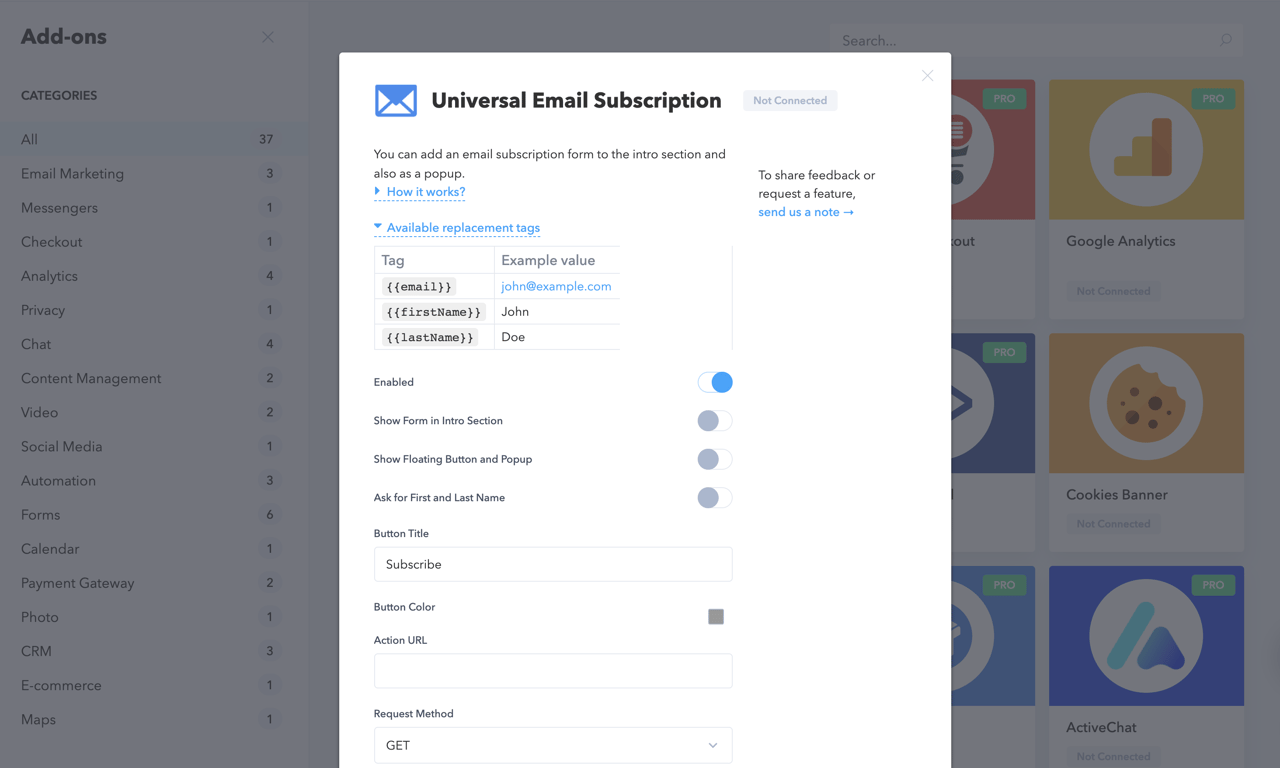 Using this add-on, the email subscription form data is submitted as a form to the specified action URL. You can add an email subscription form to the intro section and also as a popup.
