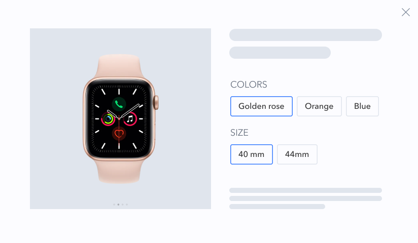 On the details page, a customer will see all the available variation alternatives and will be able to quickly switch between them. Each variation will have its own price, image, SKU, and other values as well as its unique URL.