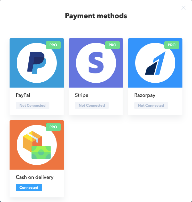 Now you can add not one, but multiple payment methods for your customers. You can add one (or all!) of the available payment gateways and cash on delivery.